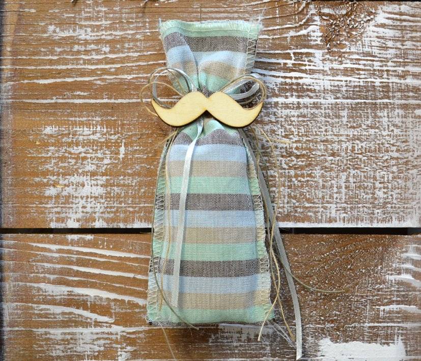 Μπομπονιέρα βάπτισης πουγκί με ξύλινο μουστάκι