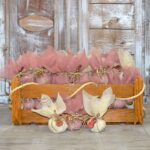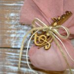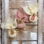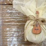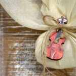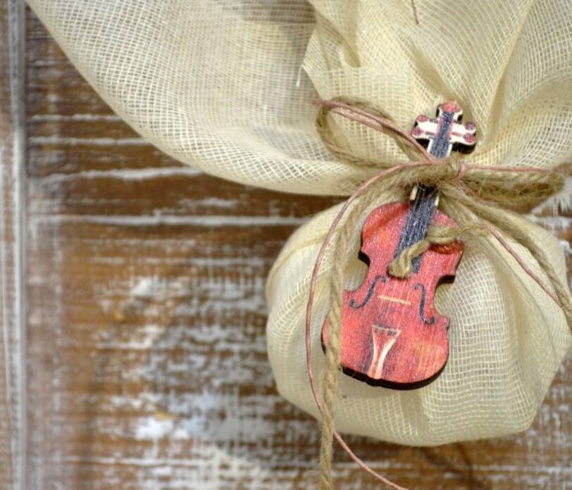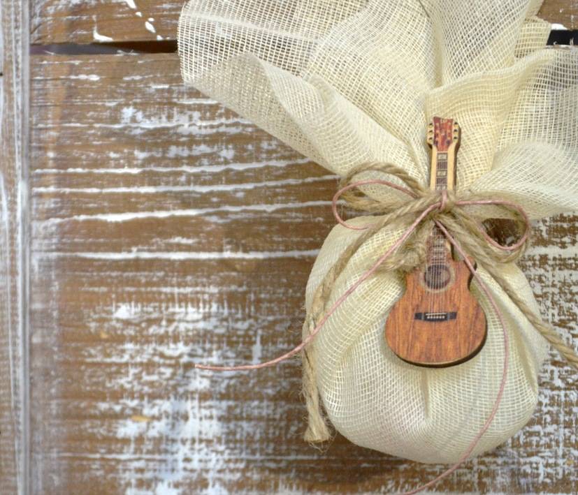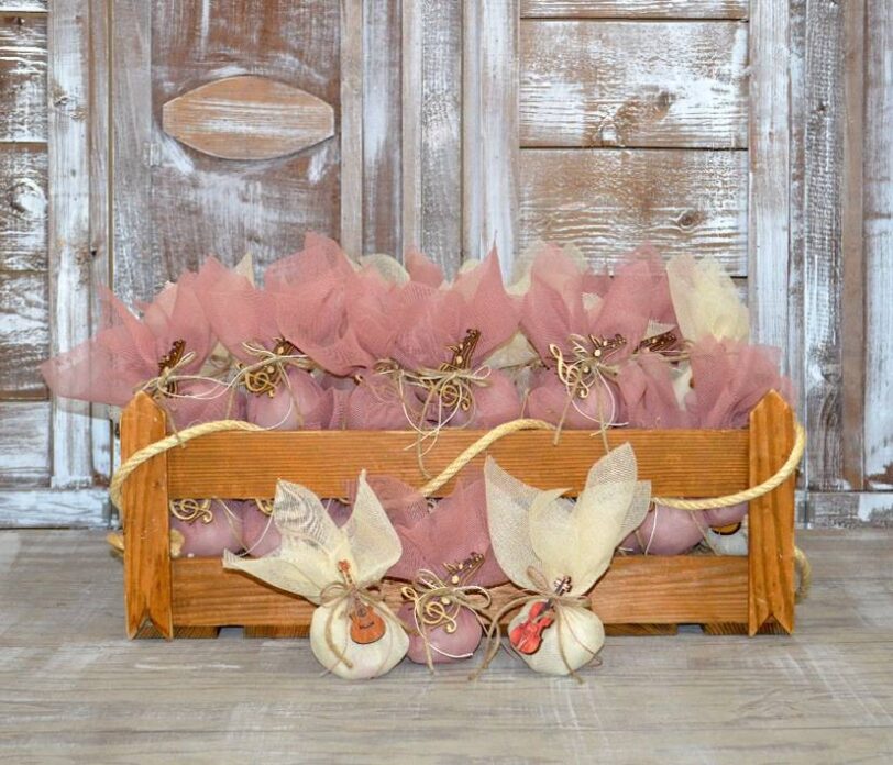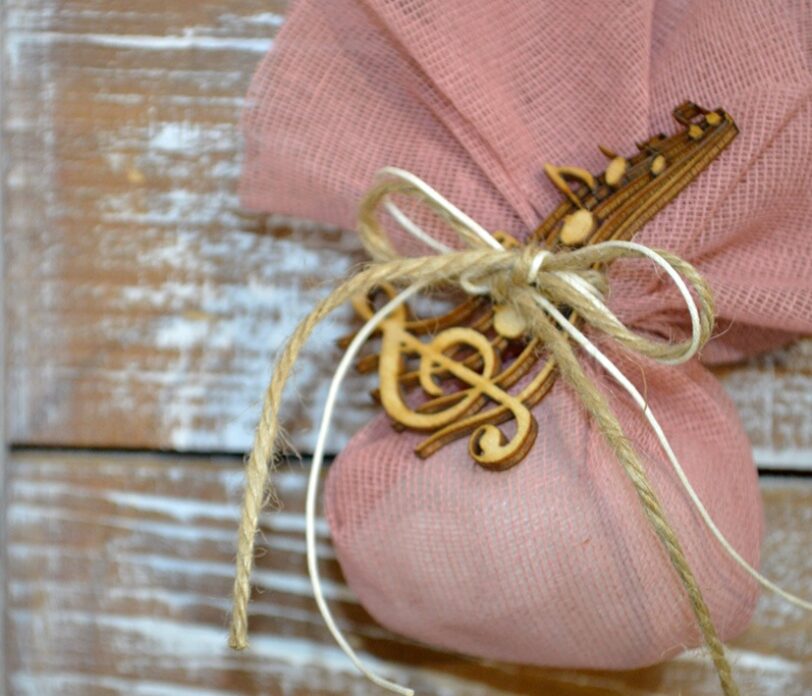 Mπομπονιέρες με γάζα σε εκρού και σάπιο μήλο διακοσμημένες με ξύλινες νότες και μουσικά όργανα.