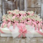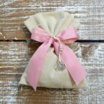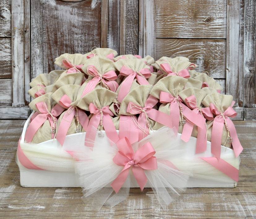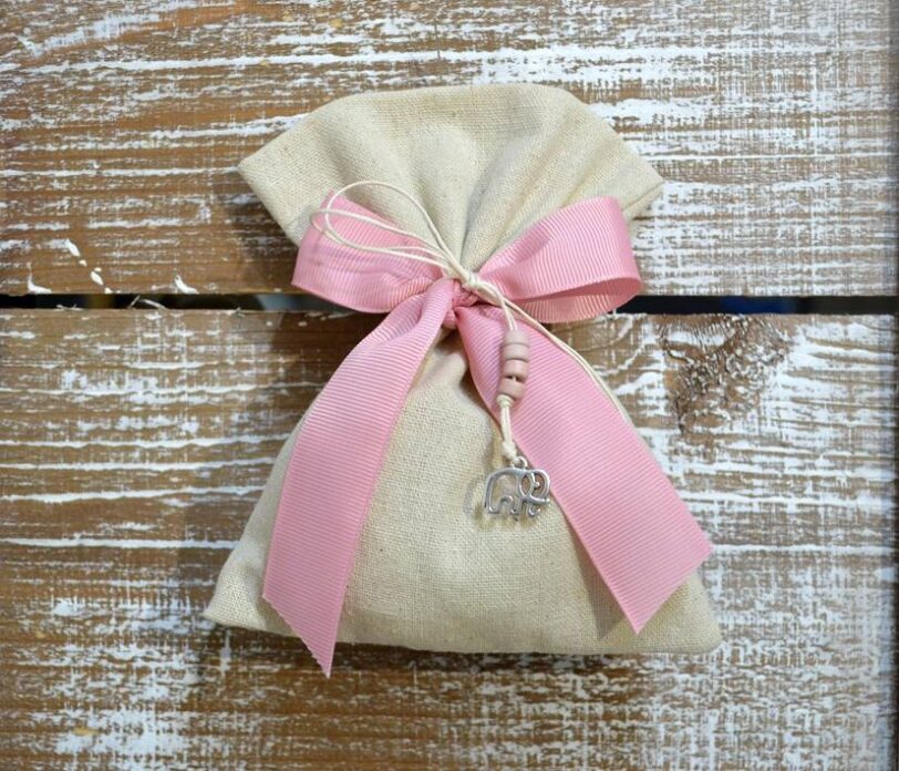 Πουγκιά βάπτισης με μεταλλικό κρεμαστό ελέγαντα στο δέσιμο.