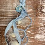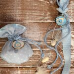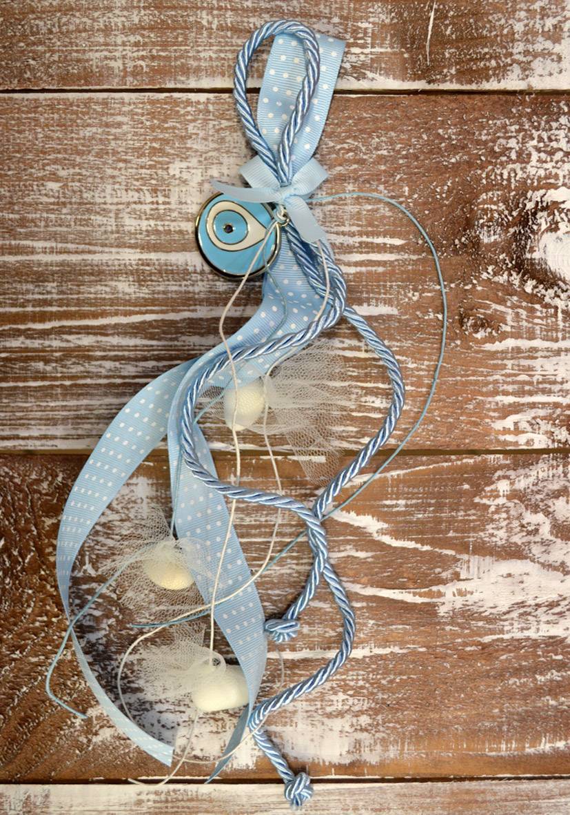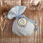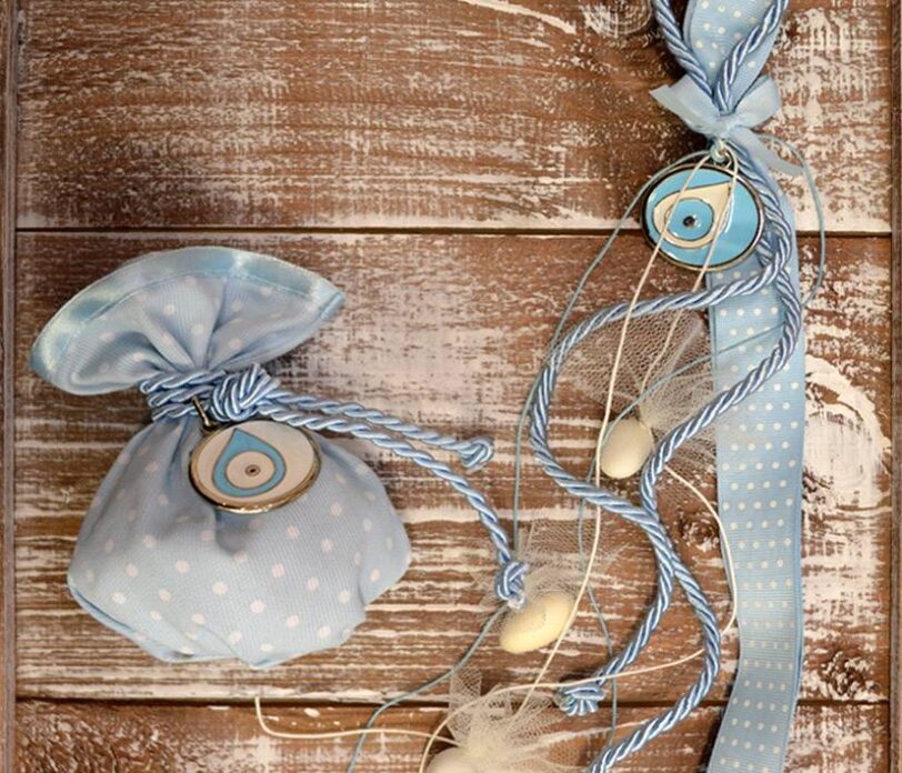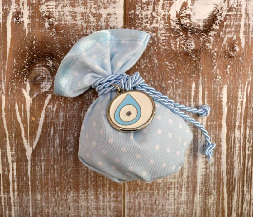 Μπομπονιέρα βάπτισης πουγγί ματάκι σιέλ και κρεμαστή ματάκι σιέλ