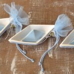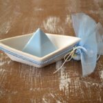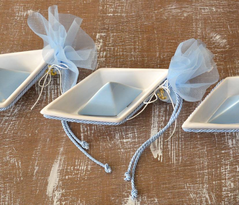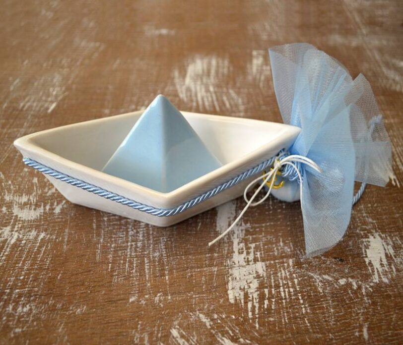 Μπομπονιέρα βάπτισης καραβάκι πορσελάνης λευκό-σιέλ