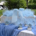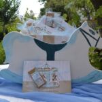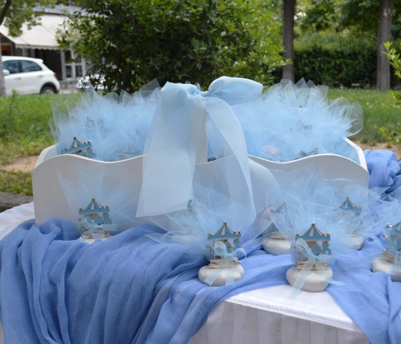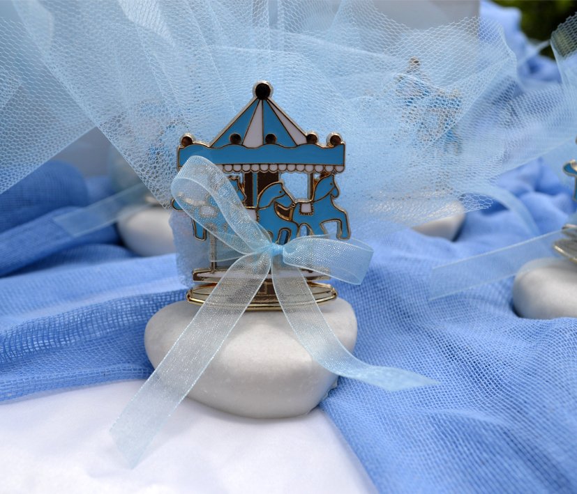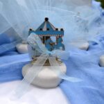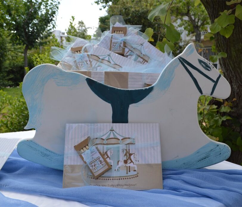 Μπομπονιέρα με μεταλικό καρουζέλ σε πέτρα και μπομπονιέρα παιδική με πάζλ και ξυλομπογιές.
