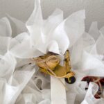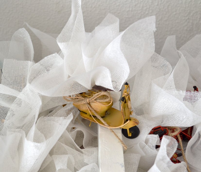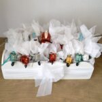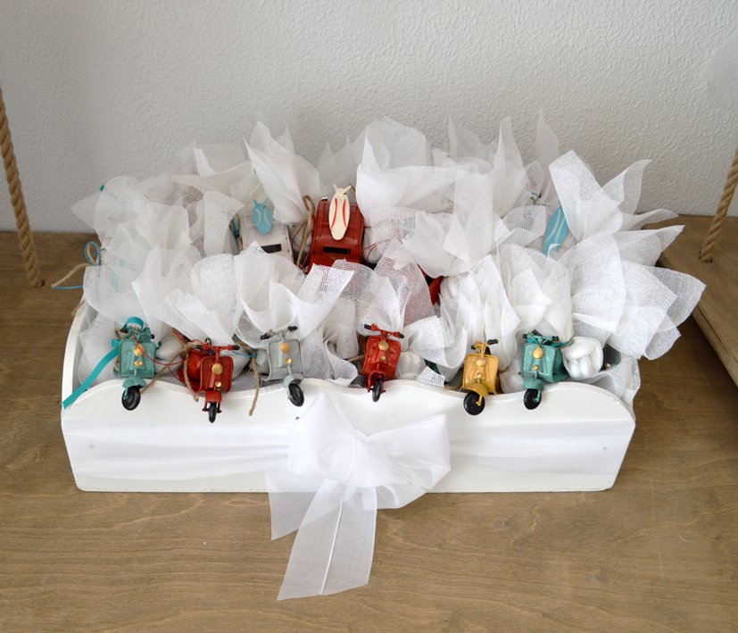 Λευκές μπομπονιέρες δεμένες με σχοινί με μεταλλικά πολύχρωμα vintage οχήματα.