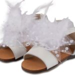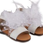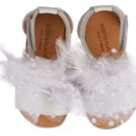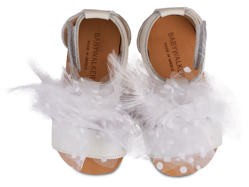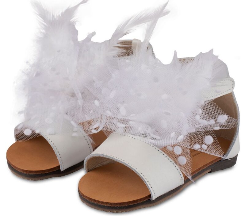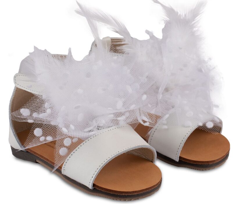 Νούμερο παπουτσιού: 20Δερμάτινο Πέδιλο Διακοσμημένο με χειροποίητο Υφασμάτινο Διακοσμητικό με Πουά Τούλι και Πούπουλα σε Εκρού χρώμα