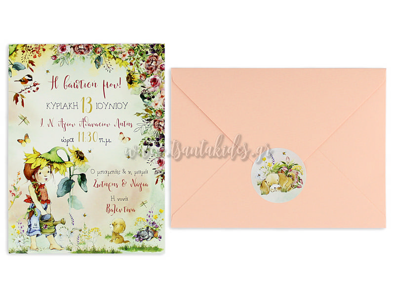 Προσκλητήριο βάπτισης για κορίτσι με θέμα τη Sharah Kah με rustic και floral στοιχεία. Το προσκλητήριο διαθέτει φάκελο διάστασης 19,5×14,5cm σε σομόν ματ χαρτί 220γρ. Η εσωτερική κάρτα είναι εκτυπωμένη σε υπόλευκο ματ χαρτί 260γρ. Το προσκλητήριο διαθέτει στρογγυλό αυτοκόλλητο διάστασης 5cm εκτυπωμένο στο ίδιο θέμα.