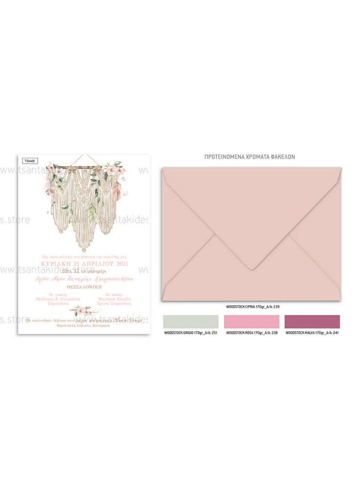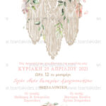 Προσκλητήριο βάπτισης για κορίτσι με θέμα Boho Macrame. Η κάρτα του προσκλητηρίου είναι τυπωμένη σε λευκό ματ χαρτί 250γρ. Το προσκλητήριο διαθέτει φάκελο διάστασης 19,5×14,5cm σε χαρτί της επιλογής σας από τους αναγραφόμενους κωδικούς.