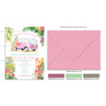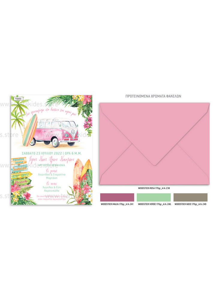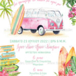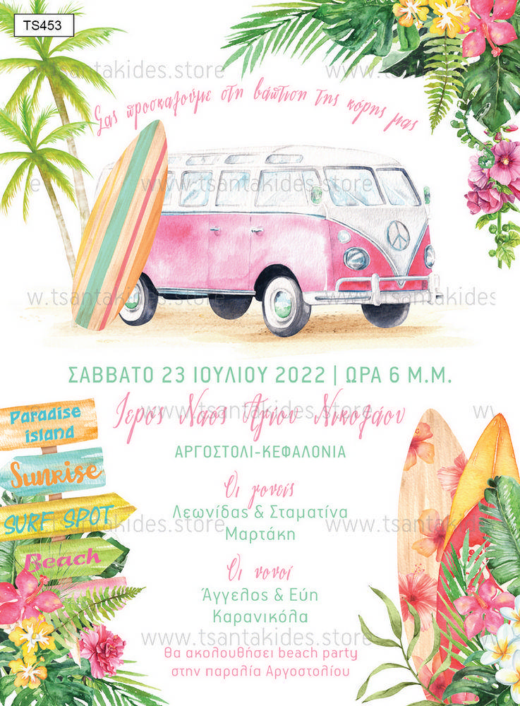 Προσκλητήριο βάπτισης για κορίτσι με θέμα Surf. Η κάρτα του προσκλητηρίου είναι τυπωμένη σε λευκό ματ χαρτί 250γρ. Το προσκλητήριο διαθέτει φάκελο διάστασης 19,5×14,5cm σε χαρτί της επιλογής σας από τους αναγραφόμενους κωδικούς.